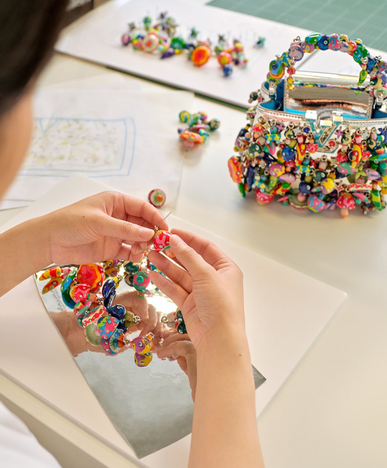 Among the standout designs are two fantastical works that sit somewhere between accessory and art piece. The Capucines Mini Mushroom, adorned with more than 100 tiny 3D-printed mushrooms, embodies Murakami’s whimsical fascination with fantasy and nature. The Capucines Mini Tentacle, wrapped in seven sinuous, candy-colored tendrils, channels his surrealist imagination. Each piece celebrates Louis Vuitton’s unrivaled craftsmanship while reflecting the artist’s childlike wonder.
